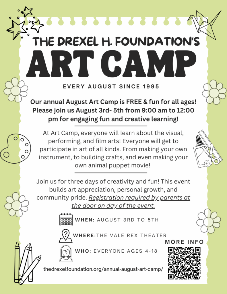 The week is FREE & fun for all ages. Art camp workshops will start at 9:00 am and end at 12:00 pm, Monday thru Wednesday, art camp is open to anyone ages 4 -18. Everyone will learn about performing, visual & film art. In 1995 we began our first events August Art Camp and Talent Show. Our art programming has developed over the years in response to suggestions. This event brings forth cultural enrichment, art appreciation, and promotes personal growth and community pride. We have accomplished sustainable cultural opportunities and advancement in art education for youth in this rural underserved region.