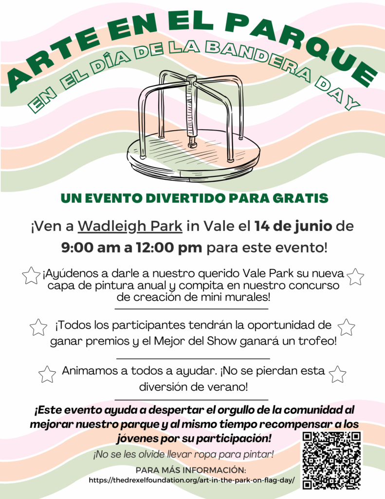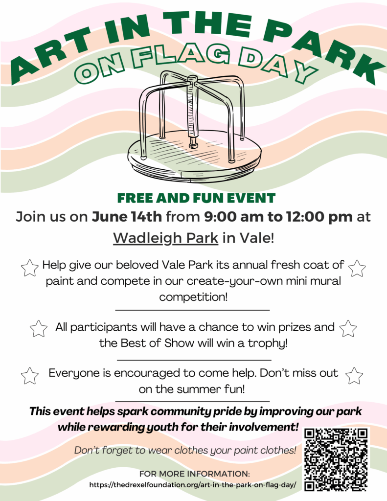We provide a mechanism for citizenship and community art awareness in our Art in the Park on Flag Day by rewarding youth for improving our park and creating mini murals.